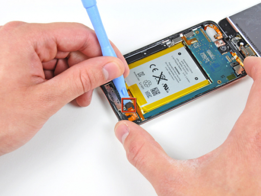 Durch den Bau des 4. Generation Touch kann das Digitizer-Kabel nicht getrennt werden, wenn die Hauptplatine nicht entfernt ist. Seien Sie besonders vorsichtig beim Umgang mit der Vorderseite, weil diese mit dem Rest des Touchs durch das sehr empfindliche Digitizer-Kabel verbunden ist.