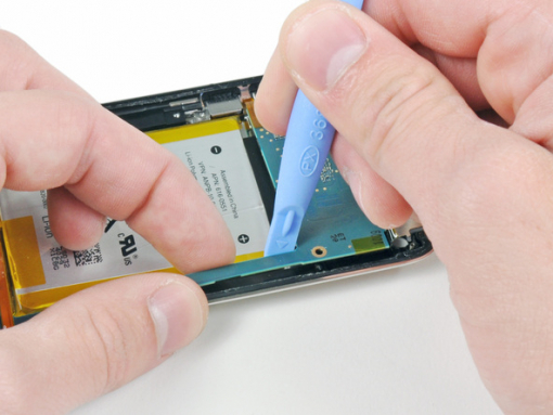 Verwenden Sie das iPod-Öffnungswerkzeug, um den Rand der Hauptplatine neben dem Akku so leicht zu hebeln, dass Sie sie mit Ihrer anderen Hand greifen können.