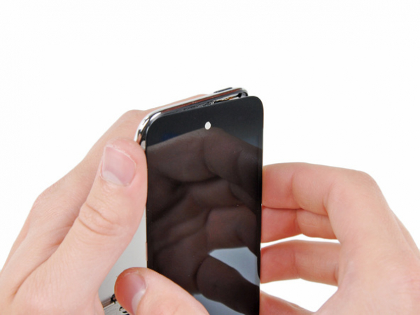 Wenn genügend Platz vorhanden ist, um den unteren Rand der Vorderseite zu greifen, hebeln Sie ihn von dem Touch, um den Klebstoff entlang der linken und rechten Seite zu entfernen.
