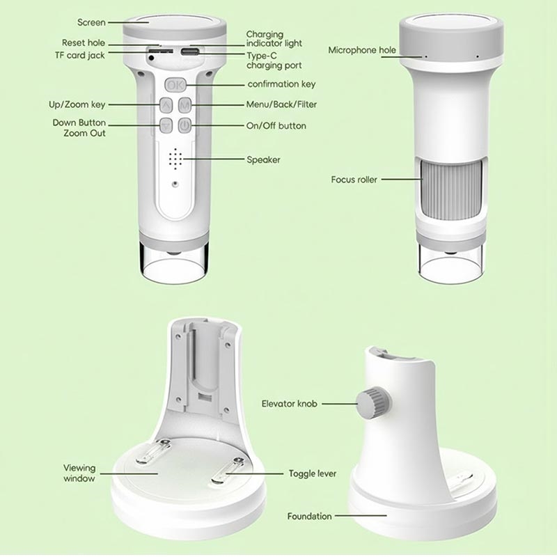 Das Digitalmikroskop F9 ist ein kompaktes und lehrreiches Gerät, das Kindern und Anfängern die mikroskopische Welt auf spielerische Weise näher bringt. Es kann sowohl in der Hand als auch auf dem Schreibtisch verwendet werden, verfügt über ein klares, rundes IPS-Display und bietet hochauflösende Foto- und Videoaufnahmen. So können junge Entdecker überall dort, wo sie neugierig sind, beobachten, aufnehmen und lernen - zu Hause, in der Schule oder im Freien.