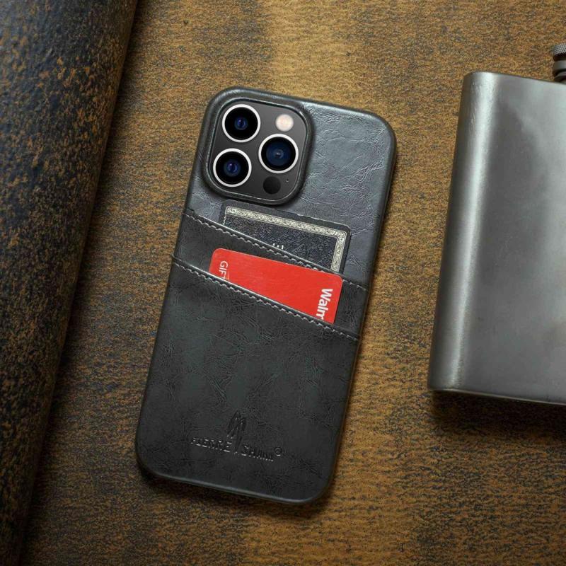 FIERRE SHANN For iPhone 14 Pro Waxy PU Leather Coated Hard PC Phone Case Card Holder Back Cover