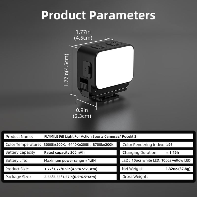 Verbessern Sie Ihre Videos und Fotos mit dem FLYMILE Action-Kamera-Fülllicht, das für eine klare, vorteilhafte Ausleuchtung von Vlogs, Nachtaufnahmen und Nahaufnahmen entwickelt wurde. Das kompakte Licht lässt sich dank starker integrierter Magnete schnell befestigen und ist dank seines spritzwassergeschützten Gehäuses (IPX4) ein zuverlässiger Begleiter für Außenaufnahmen. Mit drei Farbtemperaturoptionen und mehreren Beleuchtungsmodi können Sie sich schnell an die Umgebung anpassen und Ihre Aufnahmen scharf, natürlich und professionell aussehen lassen.