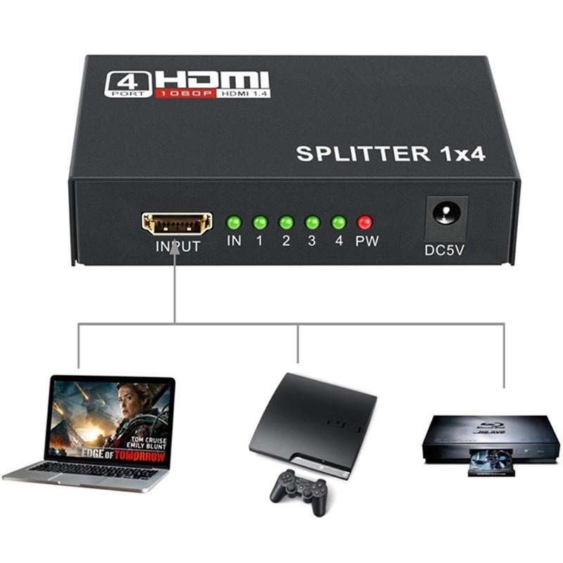 Ein sehr praktischer HDMI-Splitter mit einem Eingang und vier Ausgängen! Mit diesem HDMI-Splitter 1x4 können Sie ein HDMI-Signal von Ihrem Laptop, DVD, Set-Top-Box oder Spielkonsole an bis zu vier HDMI-Fernseher oder Projektoren gleichzeitig verteilen. Obwohl Sie ein HDMI-Signal an vier übertragen, können Sie Videos in Full HD-Auflösungen mit HD-Ton genießen, da der HDMI-Splitter die Bild- und Tonqualität nicht beeinträchtigt.