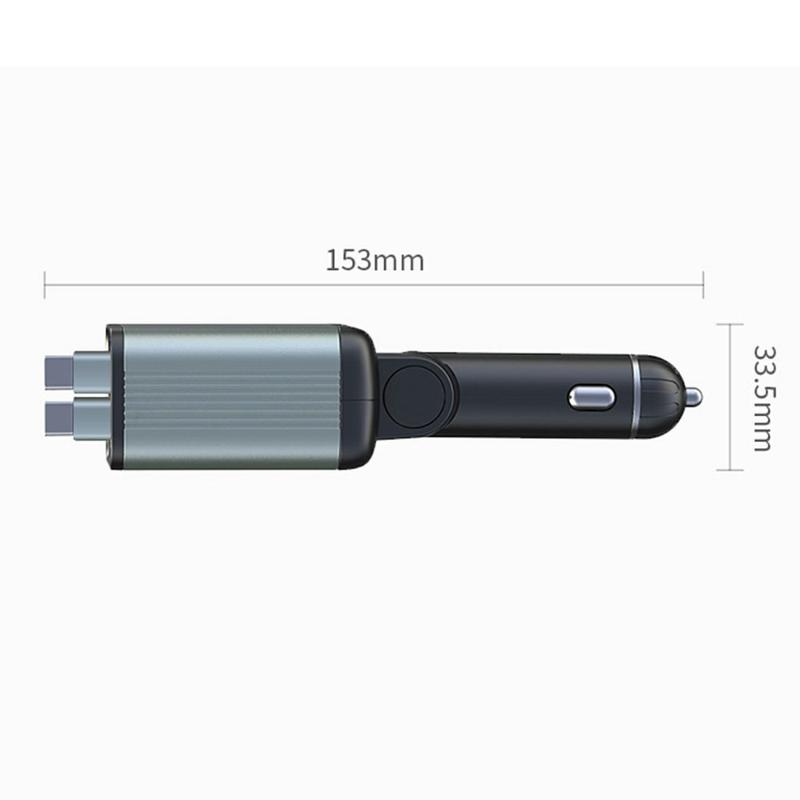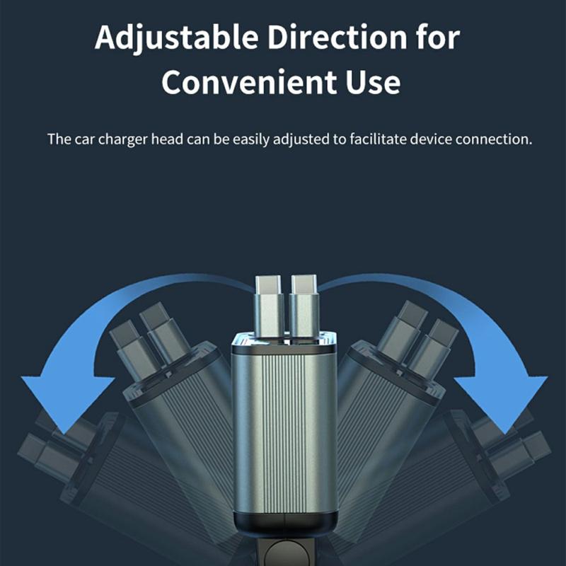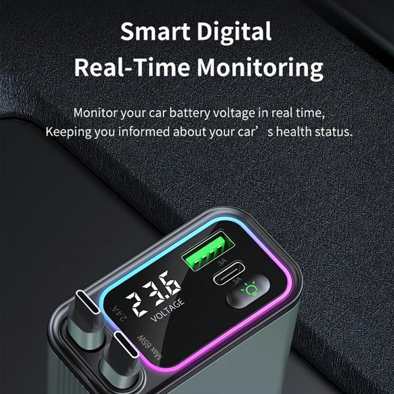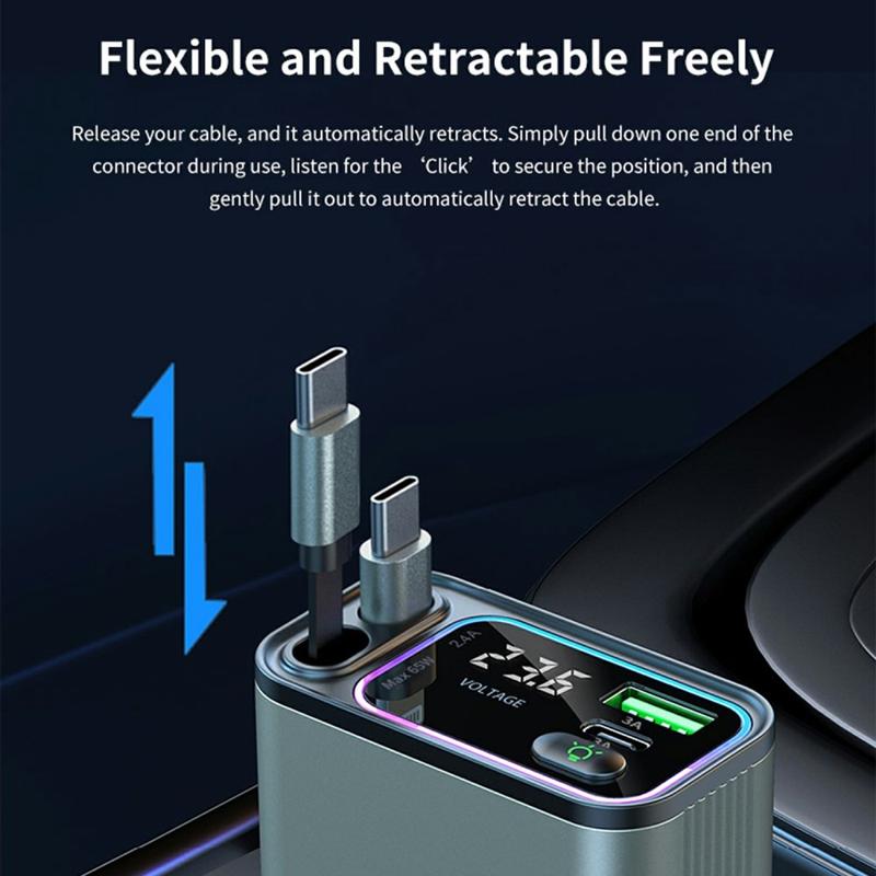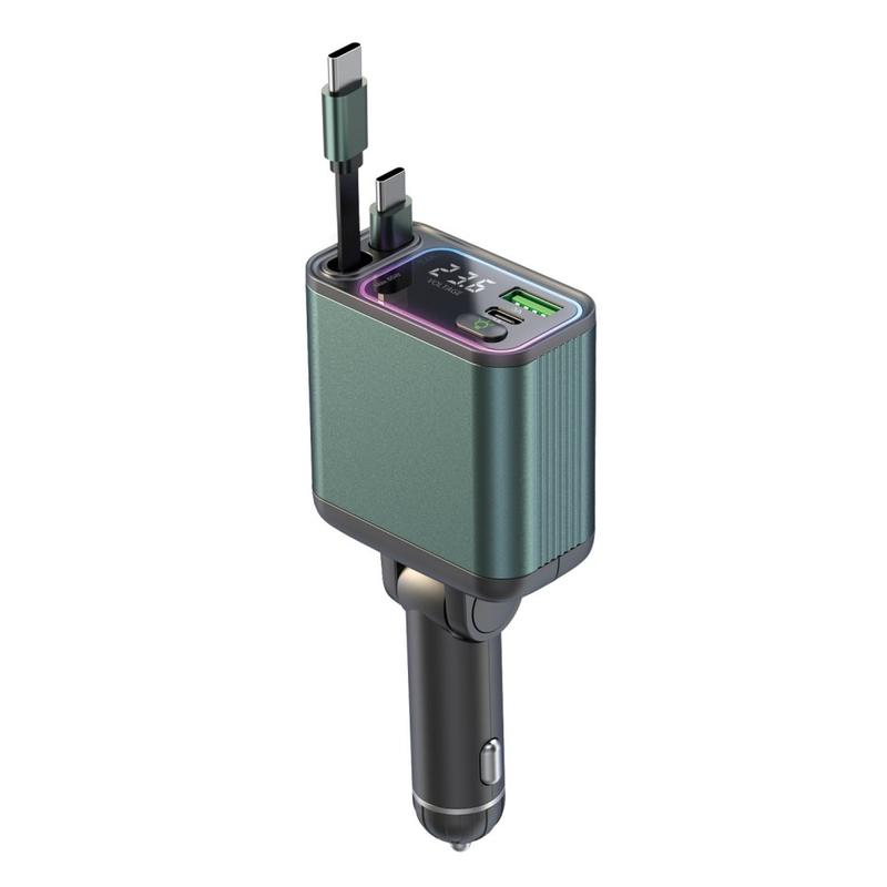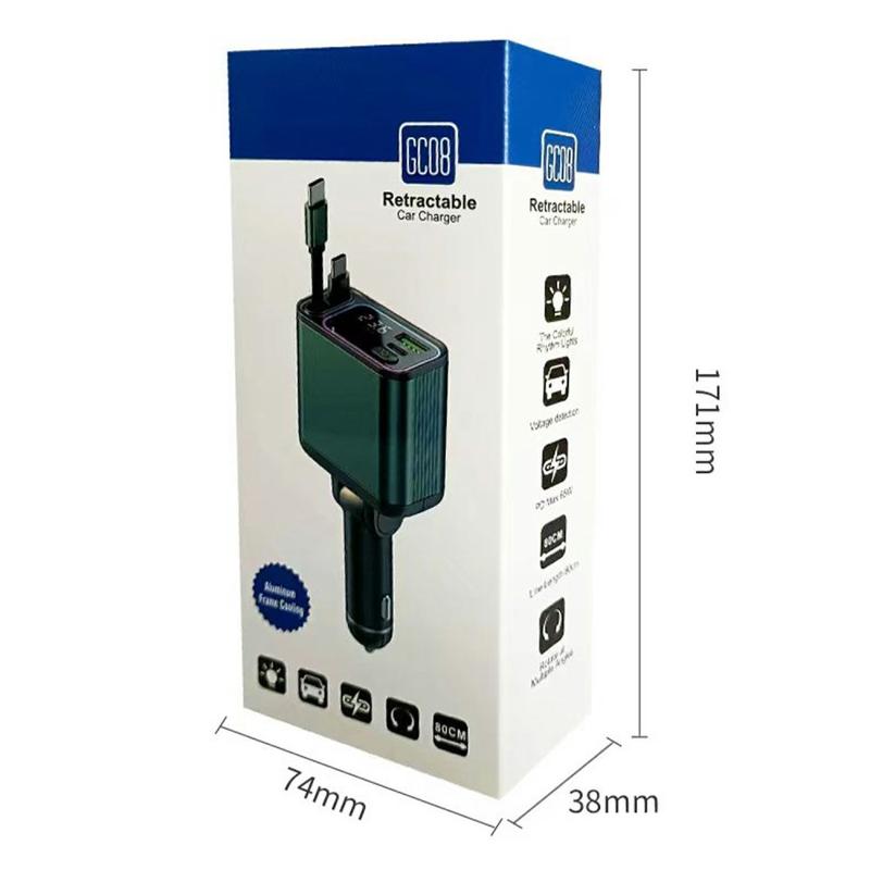 GC08A Autoladegerät mit Umgebungsbeleuchtung, Spannungsanzeige, zwei einziehbaren Typ-C-Kabeln, USB-C- und USB-A-Anschlüssen