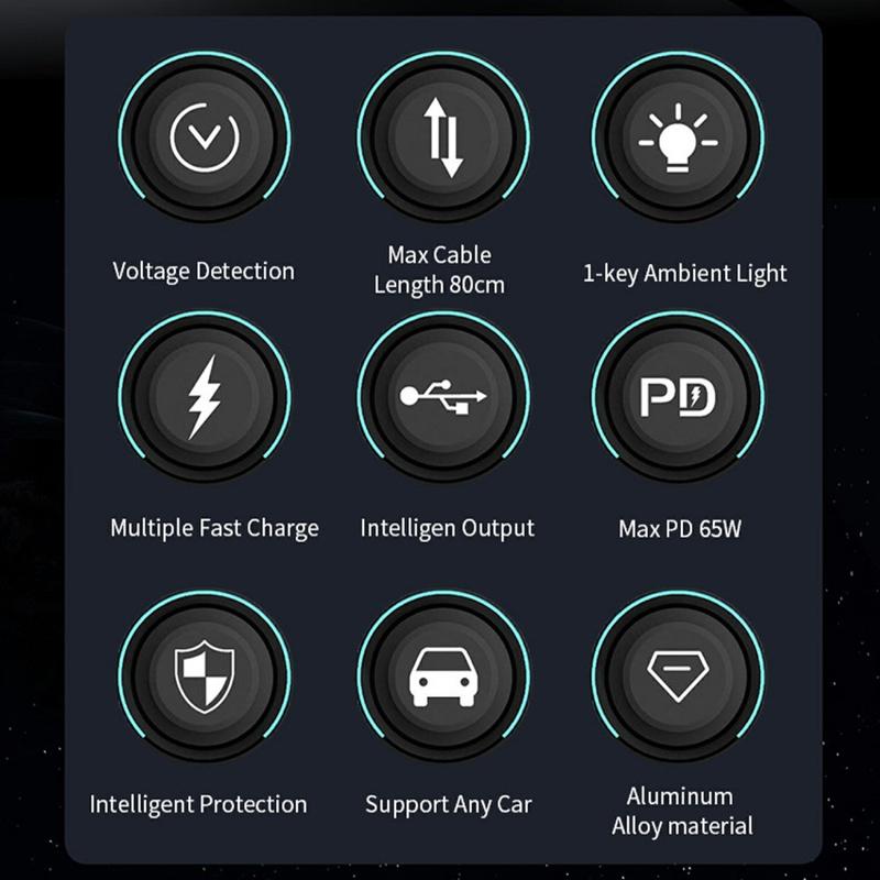 Das GC08A Autoladegerät vereint Komfort, Stil und Effizienz in einem kompakten Design. Seine beiden einziehbaren Kabel verhindern Kabelchaos, während die umfassenden Ladeprotokolle nahezu jedes Gerät abdecken, das Sie besitzen. Spannungsüberwachung in Echtzeit und robuste Sicherheitsmaßnahmen schützen sowohl Ihr Fahrzeug als auch Ihre Geräte. In Kombination mit der auffälligen Umgebungsbeleuchtung ist es das perfekte Upgrade für alle, die eine Ladelösung der nächsten Generation im Auto suchen.