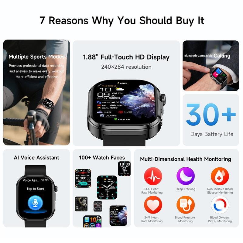 • GE52 Smart Watch mit 1,88" HD-Bildschirm - EKG-Herzgesundheitsmonitor, Bluetooth-Anrufe & Fitness-Tracker