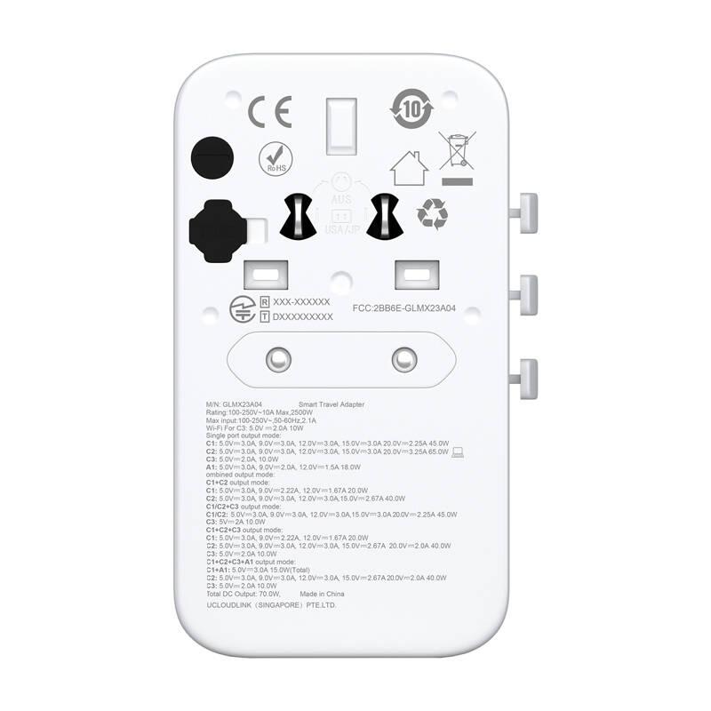 GlocalMe RoamPlug Reiseadapter mit 4G/LTE Wi-Fi Hotspot - 70W, EU, UK, JP, CN, US, AUS, 3x USB-C, 1x USB-A