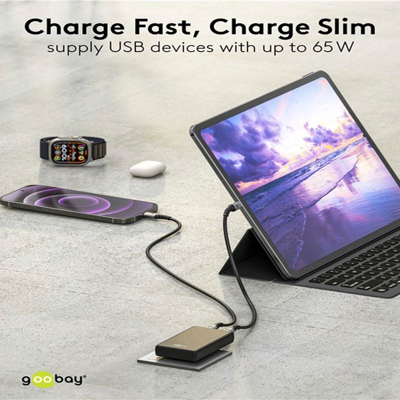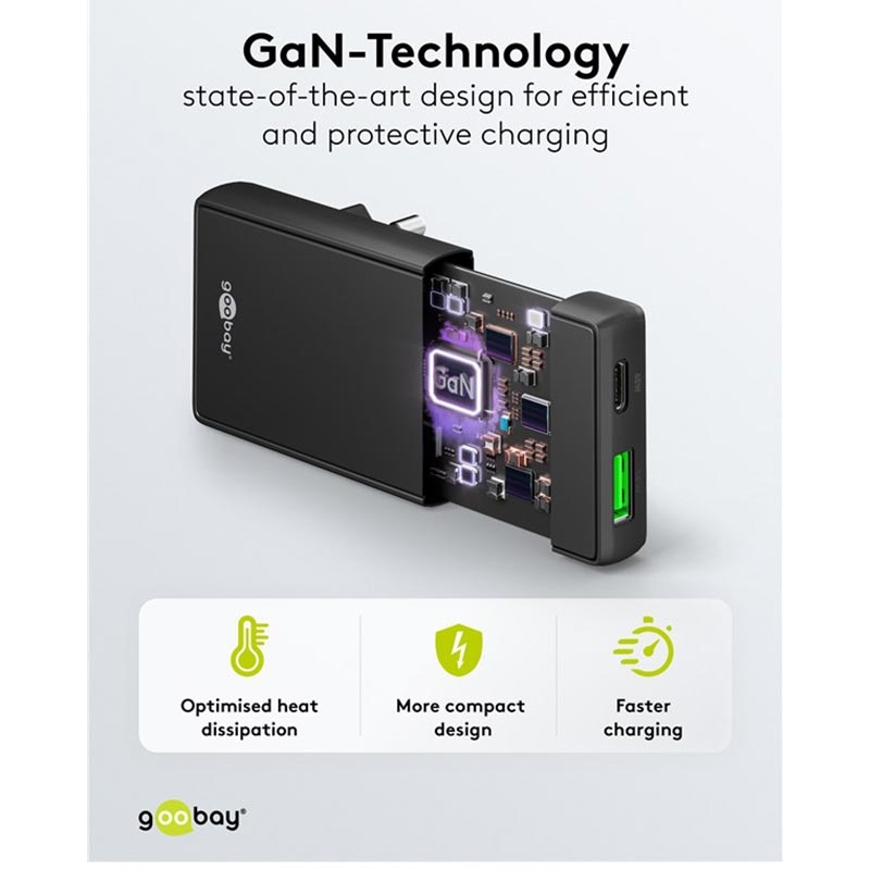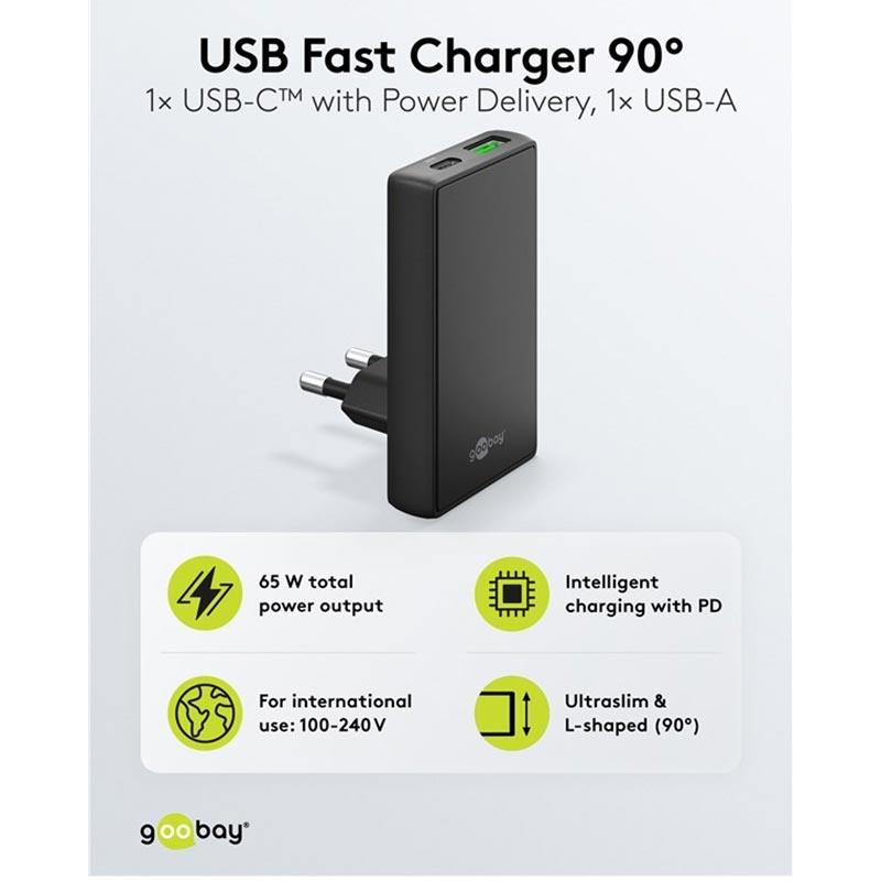 Goobay GaN Duales Schnellladegerät 90° flach 65W - Ultra-schlankes Wandladegerät mit USB-C & USB-A Anschlüssen