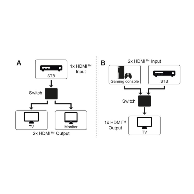 Dubbelriktad HDMI™-switch som dirigerar 1x HDMI™-ingångssignal till 2x HDMI™-enheter, t.ex. bildskärmar, eller alternativt 2x ingångssignaler till 1x terminal. HDMI™-distributör 2 in 1 ut stöder 3D och upplösningar upp till 4K @ 60 Hz och är HDCP-kompatibel, En knapp väljer antingen utgång 1 eller 2 som utgångsdisplay. Bekväm omkoppling på HDMI™-switchen gör att du slipper koppla om kablar och skyddar anslutningarna. Lämplig t.ex. för att ansluta Blu-ray-spelare, SAT/TV-mottagare, datorer, surfplattor, spelkonsoler som PS4 eller Xbox till en TV, monitor eller projektor, HDMI™ switchbox 2x1 fungerar direkt via den anslutna HDMI™-enheten utan extern strömförsörjning. Observera: HDMI™-switchen är inte en splitter!