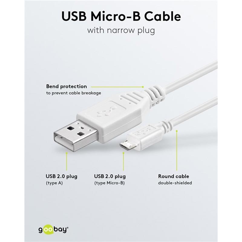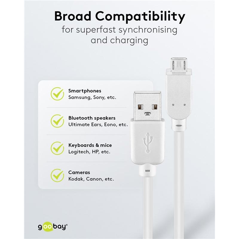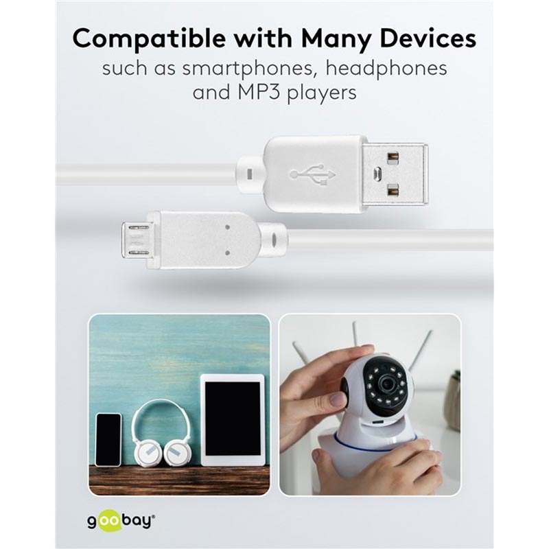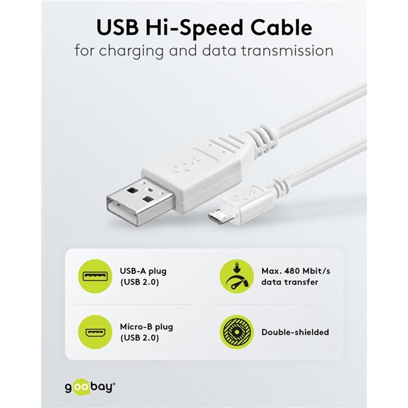 Das Goobay USB 2.0-Stecker-auf-microUSB-Stecker-Kabel ist für die Synchronisierung und das Aufladen konzipiert. Dieses Kabel ermöglicht Datenübertragungen von bis zu 480 Mbit/s und bietet Abwärtskompatibilität zu USB 1.1 für zusätzliche Flexibilität. Die Kabellänge beträgt 1m. Das Kabel ist mit den CE- und WEEE-Zertifikaten versehen.