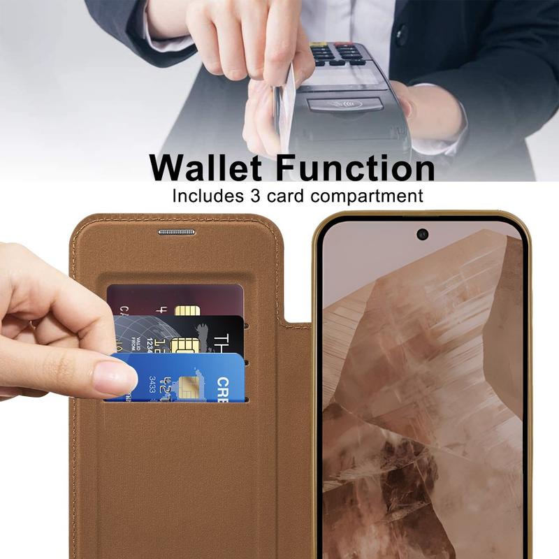 Diese Premium-Hülle für das Google Pixel 8a ist aus hochwertigem TPU, Acryl und Polyurethan gefertigt und wird in einem feinen Verfahren hergestellt, um eine zarte und exquisite Oberfläche zu gewährleisten. Es ist mit einem praktischen Kartenschlitz für einfaches Durchziehen und Ausgeben unterwegs ausgestattet und verfügt über einen starken Magneten für automatisches Schließen, wodurch es sicher und bequem ist, Gegenstände im Inneren zu verwalten. Diese Google Pixel 8a-Hülle bietet effektiven Schutz vor täglicher Abnutzung, Kratzern, Schrammen und Schrammen, während die fortschrittliche RFID-Blockierungstechnologie im Kartenschlitz dafür sorgt, dass Ihre persönlichen Daten vor Diebstahl geschützt sind. Darüber hinaus ist der integrierte Magnetring mit dem kabellosen MagSafe-Ladeverfahren kompatibel, so dass Sie Ihr Google Pixel 8a aufladen können, ohne die Tasche abnehmen zu müssen.