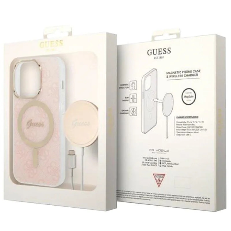Guess 4G Edition Bundle Pack iPhone 14 Pro Hülle & Drahtloses Ladegerät - Pink
