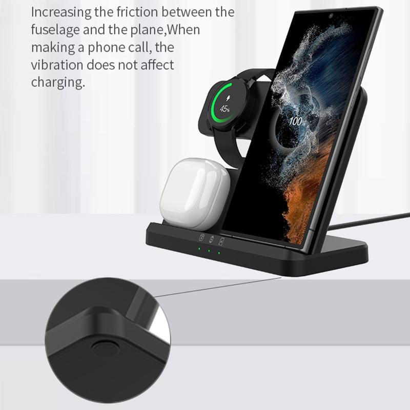 Wenn Sie auf der Suche nach einer kabellosen Multifunktions-Ladestation für Samsung Galaxy sind, ist dieses 3-in-1-Ladegerät genau das Richtige für Sie. Es ist kompatibel mit Samsung Galaxy S22, S21, S20, S10, Ultra, Note, Galaxy Watch 5, 4 und Active Buds, etc.