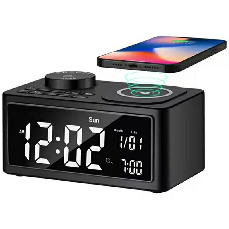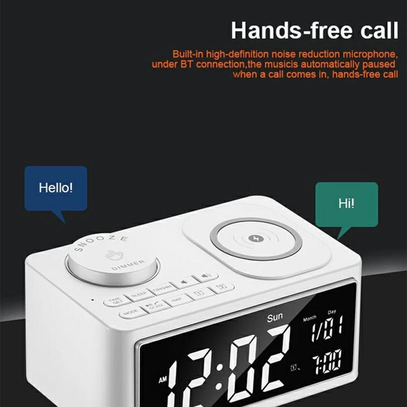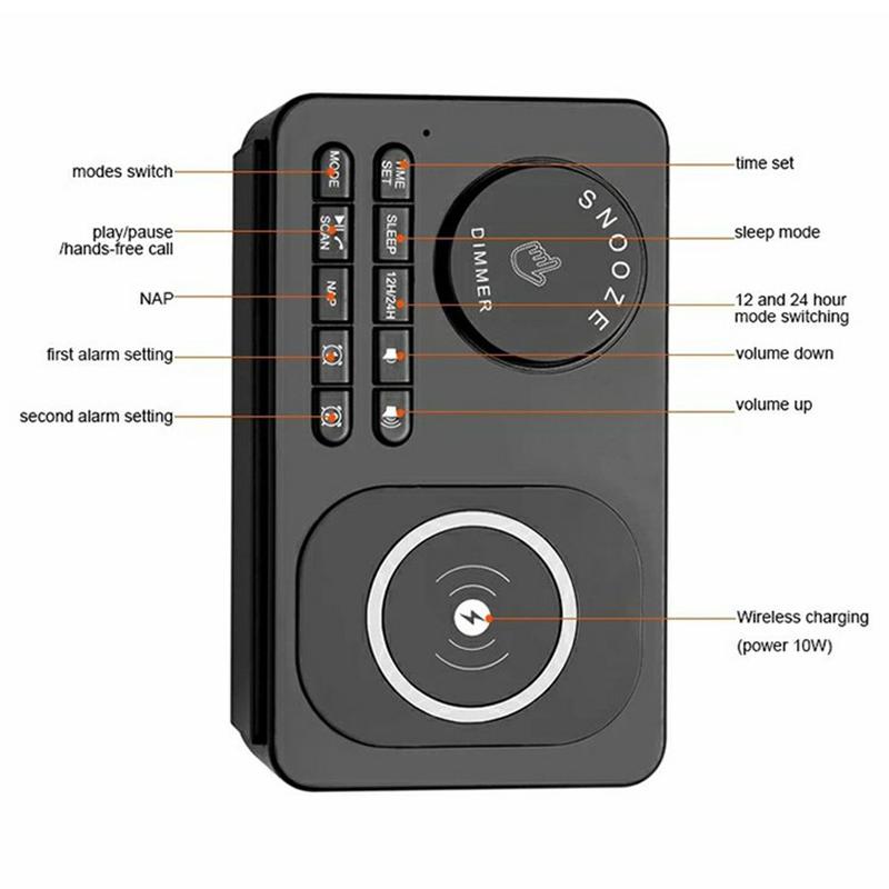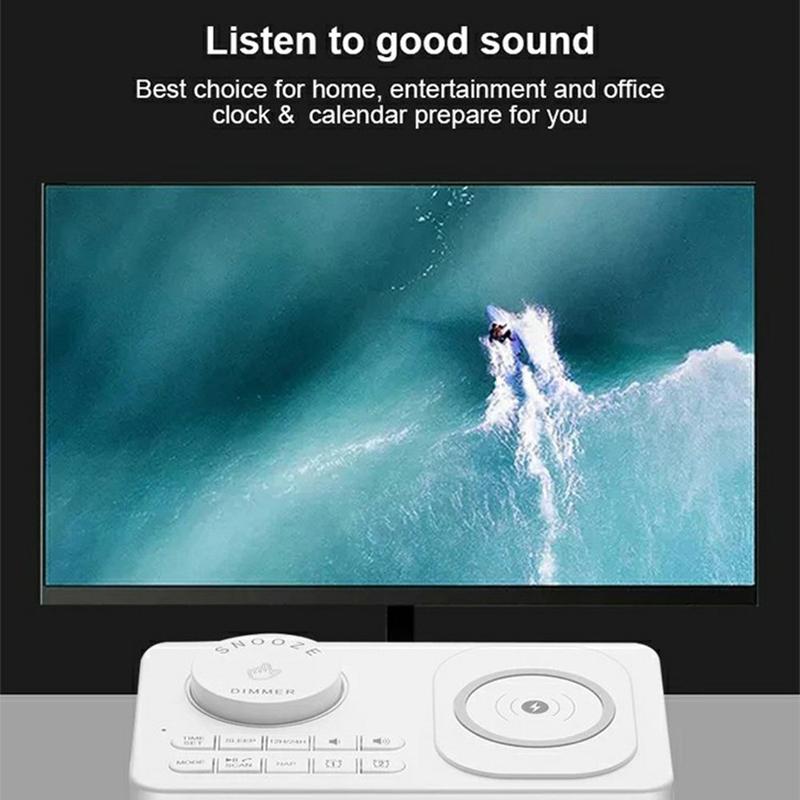 - Nachttisch-Begleiter: Wachen Sie mit Ihrem bevorzugten FM-Radiosender oder einem ausgewählten USB-Musiktitel auf, während Ihr Smartphone auf dem kabellosen Pad vollständig aufgeladen ist.