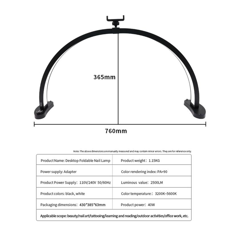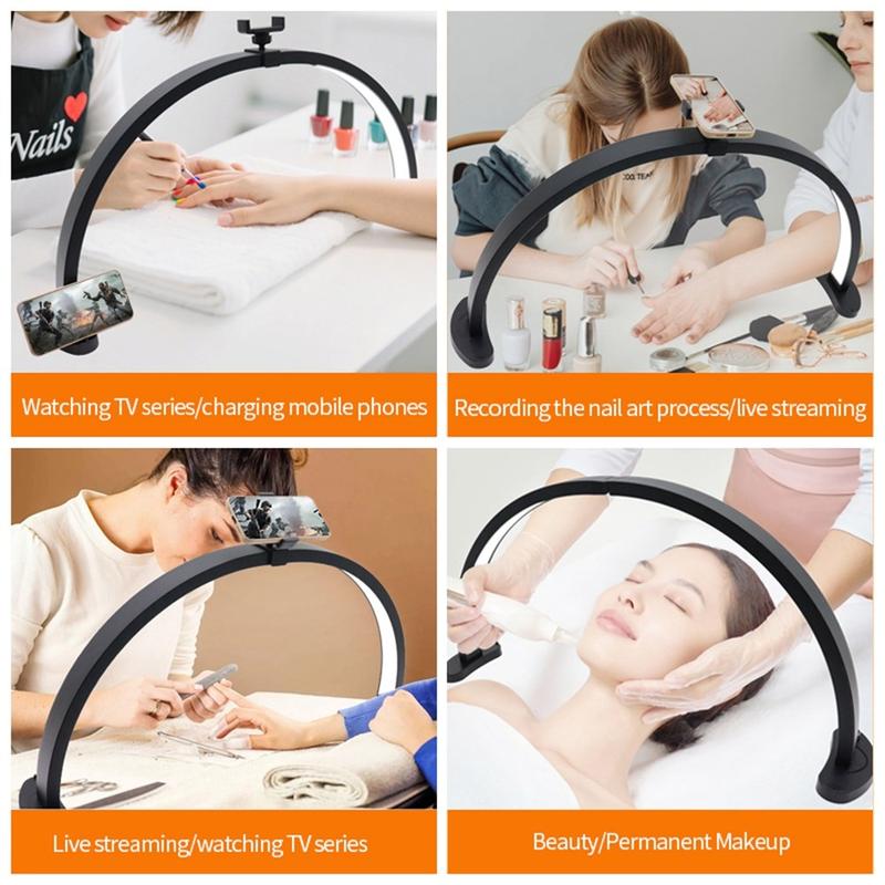 Mit der 28-Zoll-LED-Aufhellleuchte HD-M11X in U-Form erzeugen Sie ein klares, schmeichelhaftes Licht für präzise Arbeiten. Ihr halbkreisförmiges Design reduziert harte Schatten und ist damit ideal für Schönheitsbehandlungen, Nagelkunst, Tattoo-Arbeiten, die Erstellung von Inhalten und detaillierte Schreibtischarbeiten. Mit 280 zweifarbigen LEDs können Sie zwischen warmen und kühlen Farbtönen wechseln und die Stimmung von 3200K bis 5600K fein abstimmen. Der hohe Farbwiedergabeindex (CRI >90) lässt die Farben natürlich und akkurat aussehen - besonders nützlich bei der Anpassung von Make-up-Tönen, der Auswahl von Nagelfarben oder der Arbeit mit Hauttönen. Die Lampe liefert eine Helligkeit von bis zu 2500 lm bei 40 W. Im Lieferumfang enthalten sind Tischhalterungen und ein Telefonhalter-Zubehörset für einen aufgeräumten Arbeitsplatz.