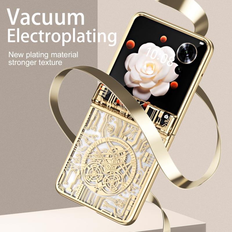 Das Mechanical Legend Series Case für Honor Magic V Flip kombiniert hervorragenden Schutz mit elegantem Design. Diese galvanisierte PC-Telefonhülle mit Bildschirmfolie bietet einen umfassenden Schutz vor Kratzern, Stürzen und täglicher Abnutzung. Das stilvolle Finish verleiht Ihrem Gerät einen Hauch von Eleganz und macht es sowohl funktional als auch modisch.