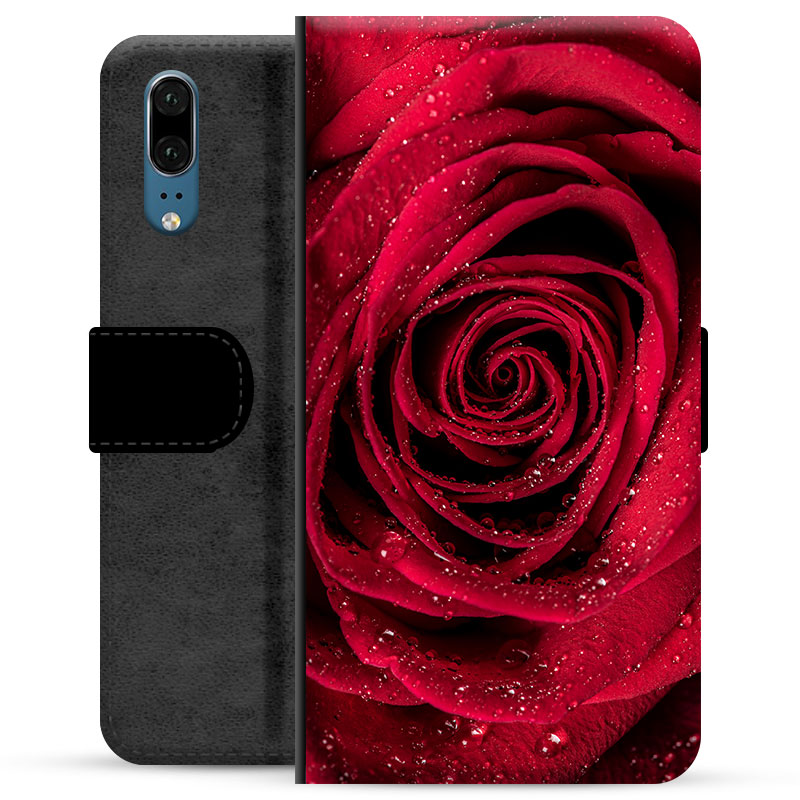 Die Huawei P20 Premium Schutzhülle mit integrierter Geldbörse in der Farbe Rose ist ein elegantes Accessoire, das Funktionalität und Stil vereint. Diese Hülle wurde speziell für das Huawei P20 entworfen und bietet einen optimalen Schutz für Ihr Smartphone. Die Vorderseite ziert ein atemberaubendes, detailliertes Rosenmotiv auf einem schwarzen Hintergrund, das durch Wassertropfen akzentuiert wird, was der Oberfläche eine realistische Textur verleiht.