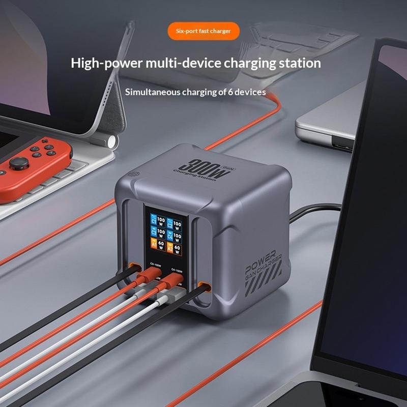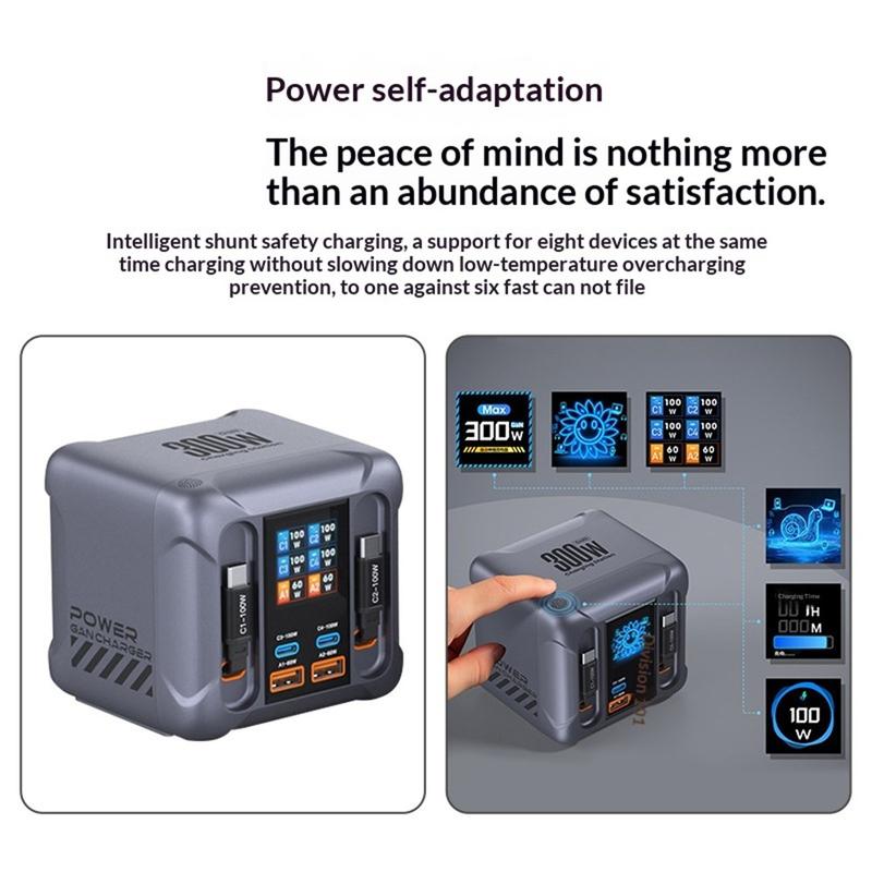 HW866 300W GaN-Tischladestation mit LCD-Display - 6-fach-Ladegerät mit 2 einziehbaren USB-C-Kabeln, EU-Stecker