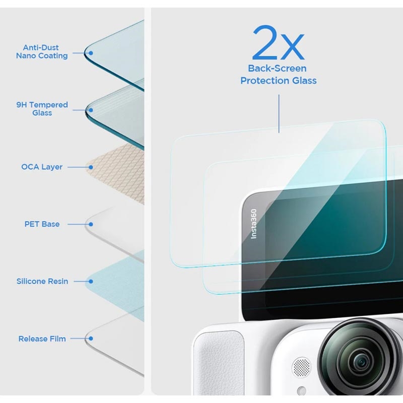 Das 0.3mm dünne, gehärtete Glas hat die branchenübliche Härte von 9H und ist somit resistent gegen Kratzer durch Schlüssel, Münzen und anderer Gegenstände ihrer Handtasche oder Taschen. Darüber hinaus ermöglicht die oleophobe Oberfläche und die glatten 2.5D-Kanten eine einfache Reinigungsmöglichkeit und Komfort beim Benutzen des Touchscreens Ihres Insta360 Go Ultra.