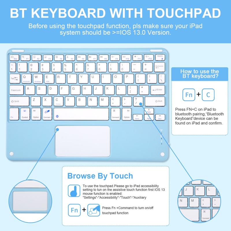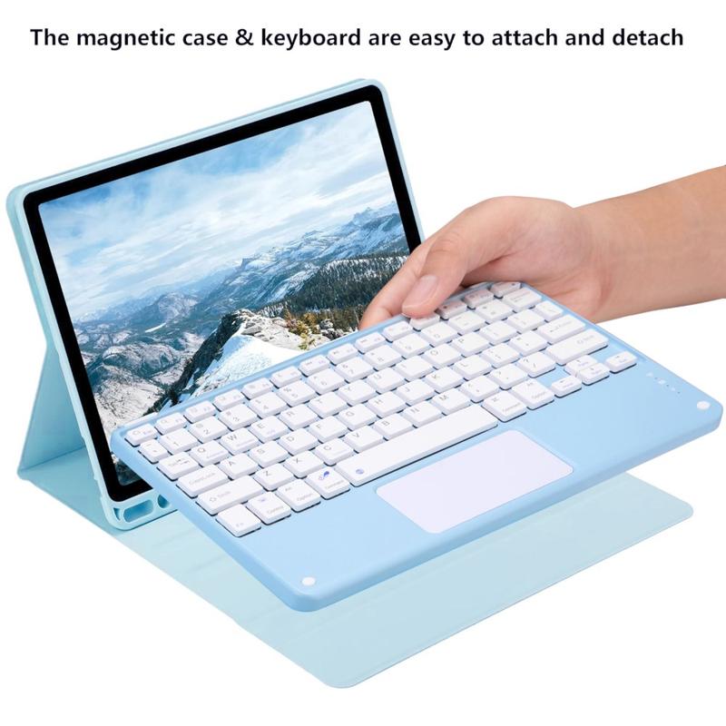 Erweitern Sie Ihr iPad Air 11 2026/2025/2024, iPad Air 2022/2020 mit der Bluetooth-Tastaturhülle, einem multifunktionalen 2-in-1-Zubehör, das Schutz, Produktivität und Stil vereint. Diese elegante Hülle aus hochwertigem Polyurethan bietet umfassenden Schutz vor Kratzern, Stößen und Fingerabdrücken und sieht dabei auch noch professionell aus. Die Bluetooth-Tastatur lässt sich kabellos verbinden und ermöglicht ein flüssiges, reaktionsschnelles Tippen, während das integrierte Touchpad eine Multi-Gesten-Steuerung für müheloses Navigieren unterstützt. Dank der beleuchteten Tastatur können Sie auch in schwach beleuchteten Umgebungen bequem tippen. Der integrierte, verstellbare Ständer bietet einen ergonomischen Betrachtungswinkel und eignet sich somit perfekt zum Tippen, Streamen oder Lesen. Diese Tastaturtasche wurde für den Geschäfts-, Reise- oder Alltagsgebrauch entwickelt und verwandelt Ihr Tablet in eine tragbare Workstation.