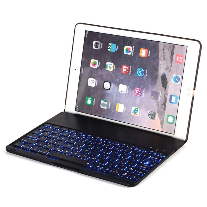 Schützende Aluminium Schale mit einer schlanken, farbig beleuchteten Bluetooth Tastatur.