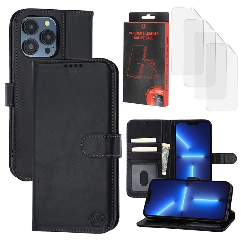 MyTPhone CardMate Premium Leder Wallet Case für iPhone 13 Pro Max, iPhone 12 Pro Max - Standfunktion, Kartenhalter, Unterstützung für drahtloses Laden, 2x Displayschutzfolie