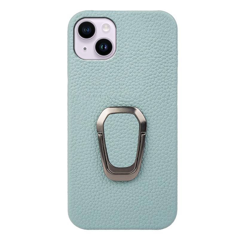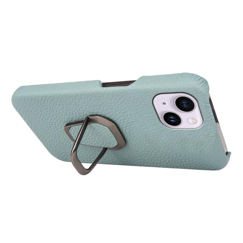 For iPhone 14 Plus Genuine Leather Coated PC Protective Phone Cover Ring Holder Kickstand Design Litchi Texture Non-Slip Shockproof Case