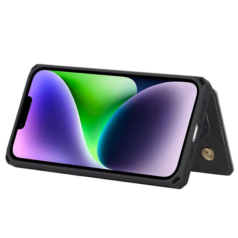 • For iPhone 14 Plus Kickstand Function Magnetic Snap Button Phone Cover Shell Anti-scratch PU Leather+TPU Phone Case with Card Slot and Strap - Made of TPU+PU leather materials, wear-resistant and durable to use - Card slots design, convenient to store ID/credit cards and money - The card holder can act as a kickstand for hands-free viewing - The raised bezels are higher than the screen level to protect your screen from scratches - The magnetic snap buttons keep the cash money and cards safe and prevent accidentally dropping - Precise cutouts ensure full access to ports and function buttons, speakers and camera - Provides protection against daily wear and tear, scratches, marks and scrapes - With a handy strap, easy to carry