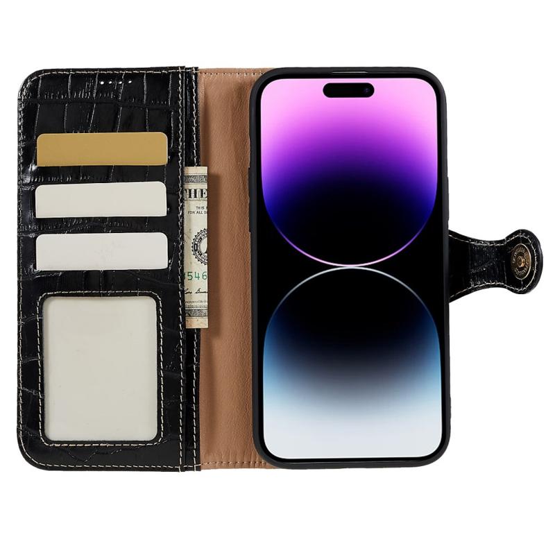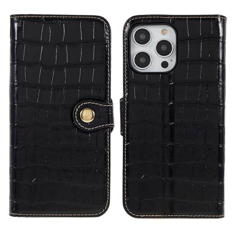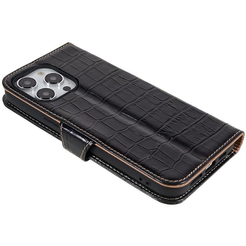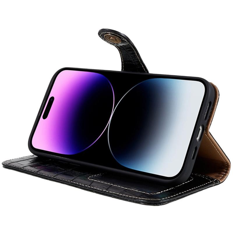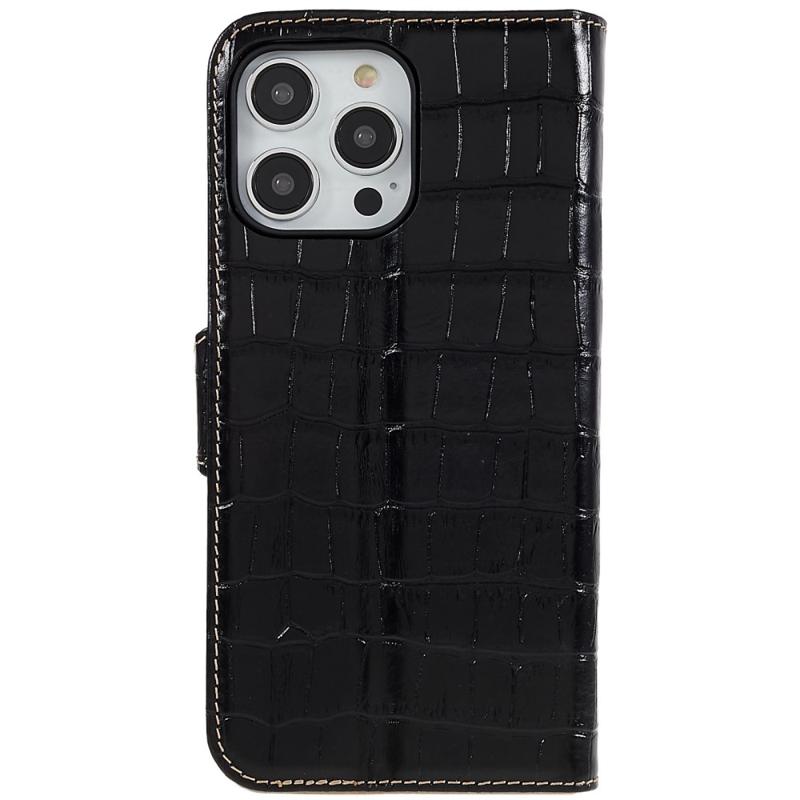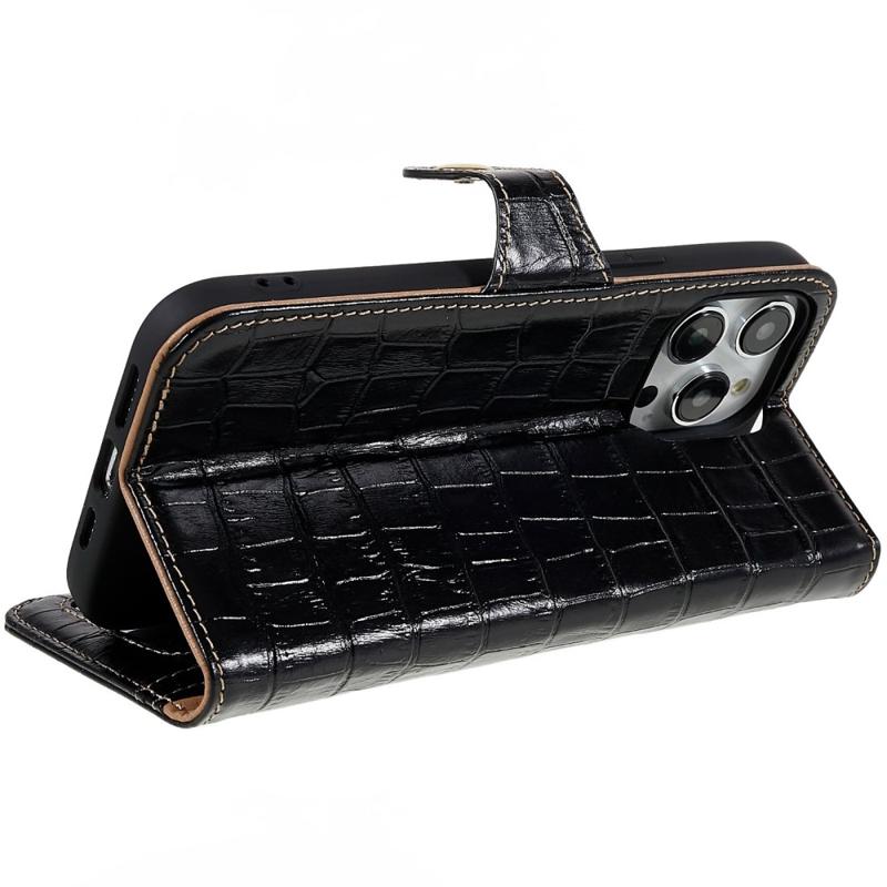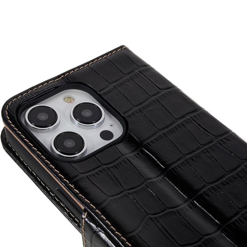 For iPhone 14 Pro Max Genuine Cowhide Leather Phone Case Crocodile Texture Stand Flip Wallet Cover