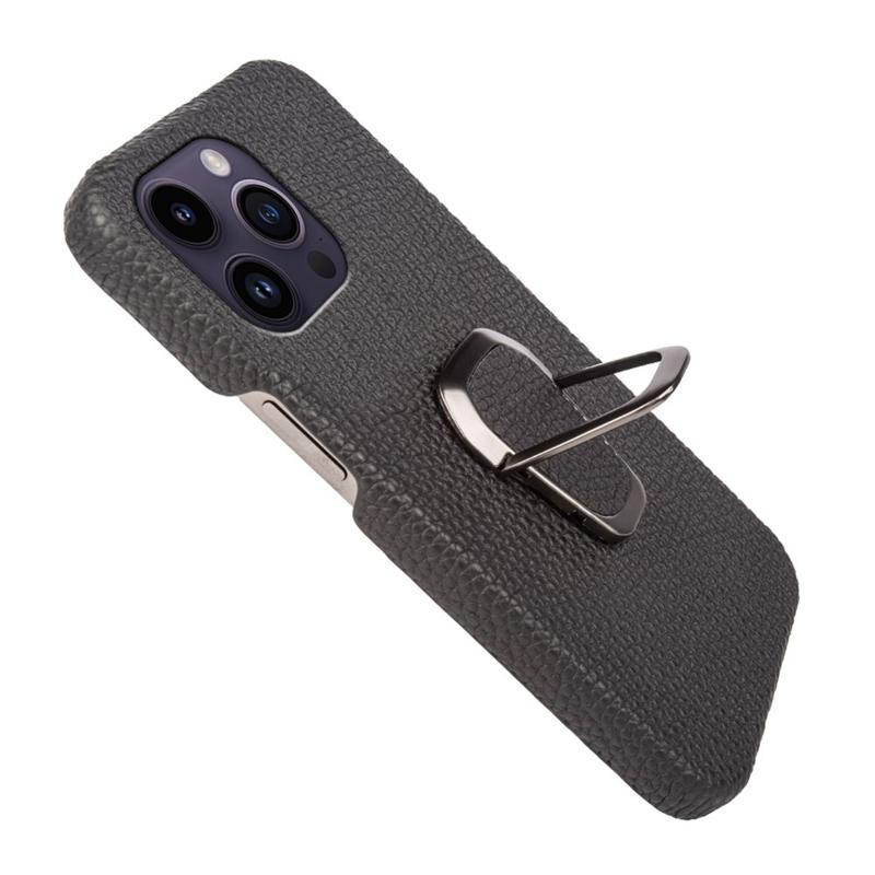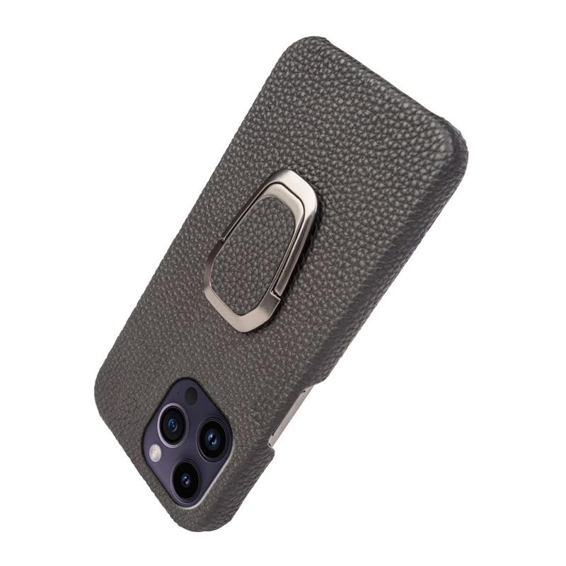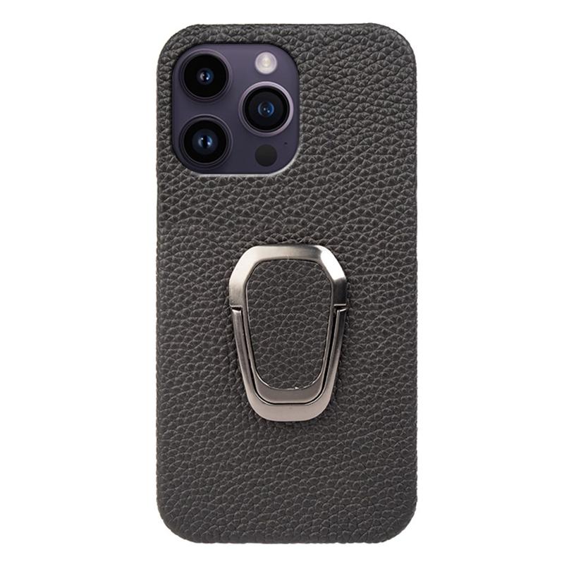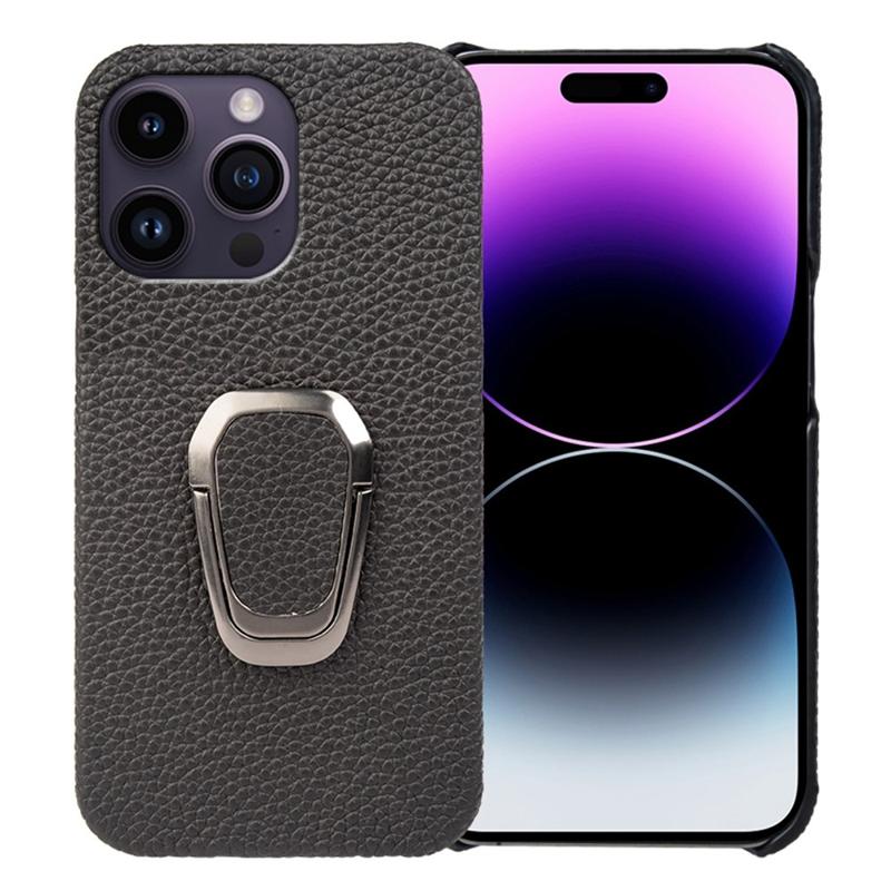 For iPhone 14 Pro Max Genuine Leather + Hard PC Protective Shell Litchi Texture Ring Kickstand Anti-Drop Phone Cover