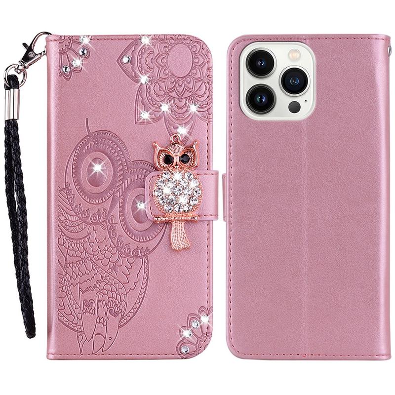 iPhone 15 Pro Eule Strass Wallet Hülle - Rose Gold