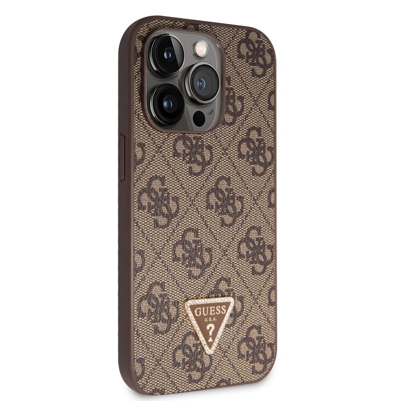 iPhone 15 Pro Guess 4G Strass Triangle Metal Logo Hülle mit Crossbody Riemen - Braun