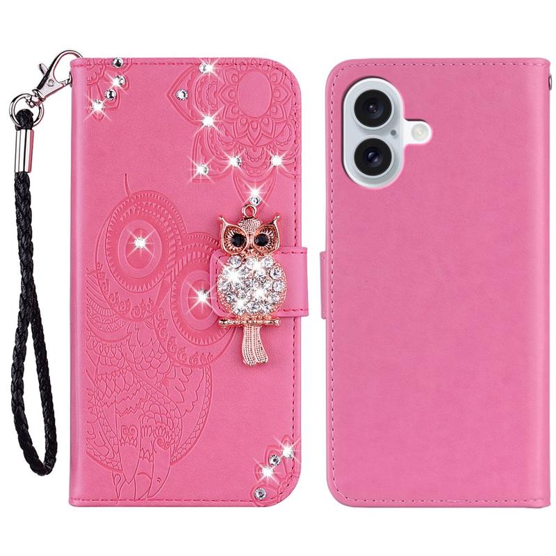 iPhone 16 Eule Strass Wallet Hülle - Hot Pink