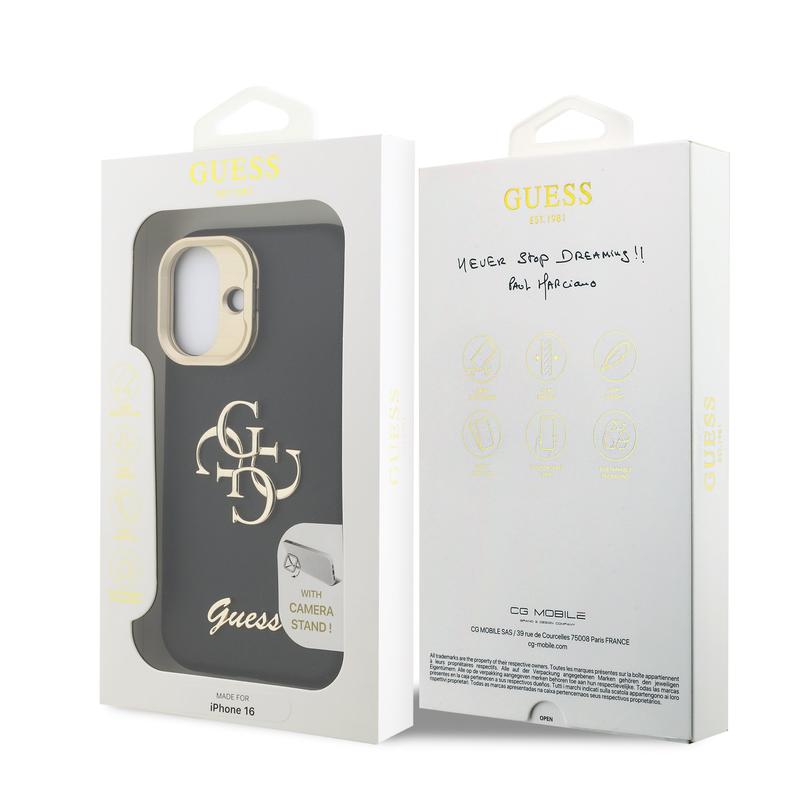 Guess Grained 4G Logo Standkamera-Rahmengehülle für iPhone 16 - Designer Style mit Hands-Free Ease