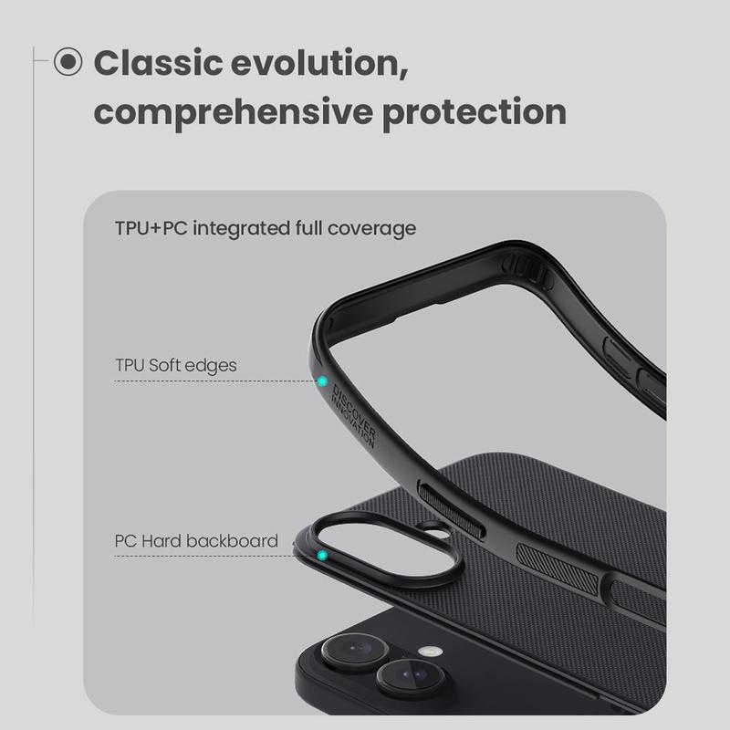 Nillkin hat die neue, leistungsstärkere Pro-Version der Super Frosted Shield Hülle für Ihr wertvolles iPhone 16 entwickelt. Ultimativer Fallschutz, dank Dual-Layer-Design - PC-Rückseite mit TPU-Rahmen.