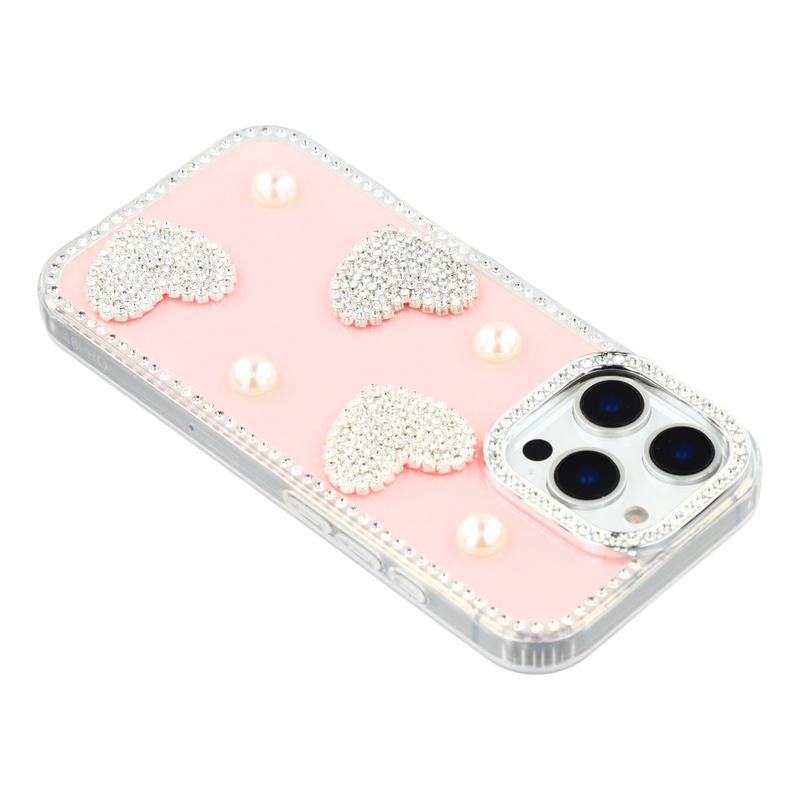 Diese iPhone 16 Pro Max Hülle kombiniert zuverlässigen Schutz im Alltag mit glamourösem Stil. Mit schimmernden Strasssteinen an den Rändern und funkelnden Perlenherzen auf der Rückseite verwandelt sie dein iPhone 16 Pro Max in ein modisches Accessoire und schützt es gleichzeitig vor Kratzern und Stößen.
