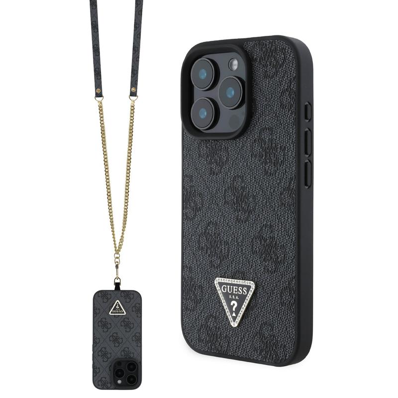 iPhone 16 Pro Guess 4G Strass Triangle Metal Logo Hülle mit Crossbody Riemen