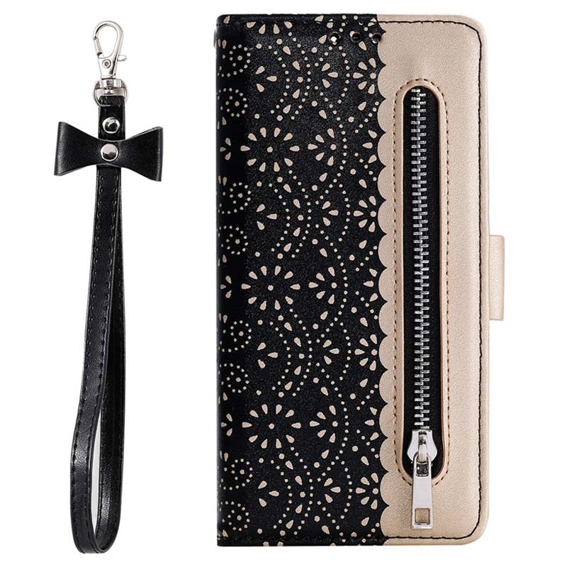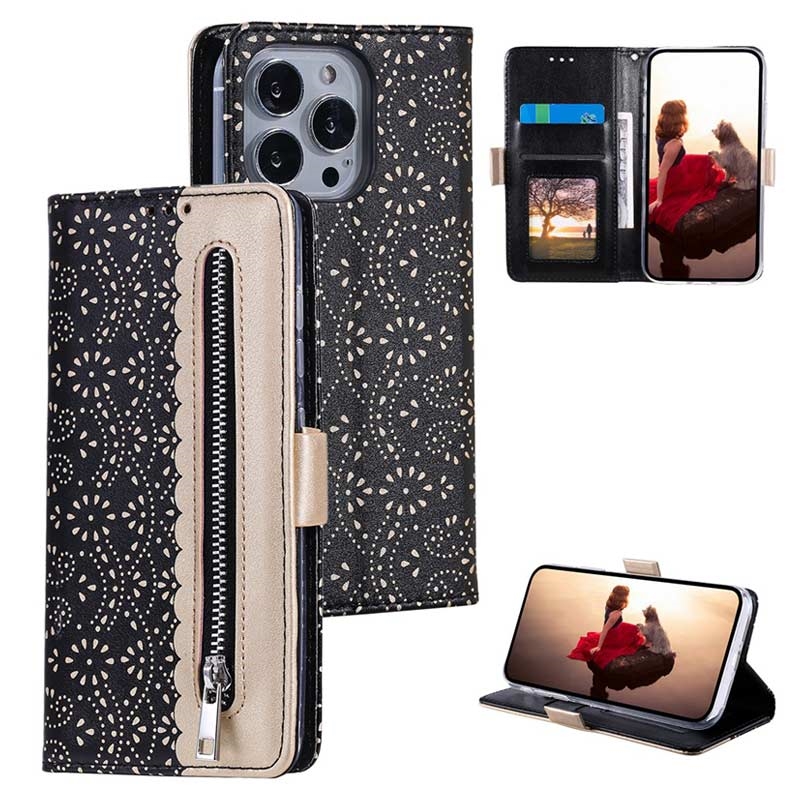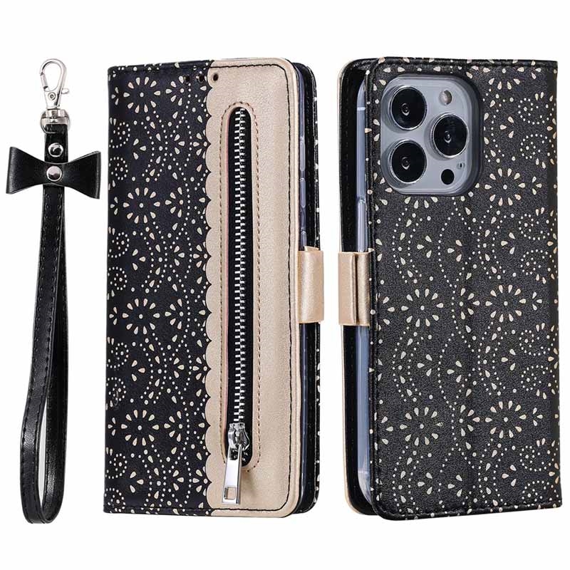 Diese unglaublich stilvolle Brieftasche mit Spitzenmuster schützt Ihr iPhone 16 Pro vor Beschädigungen, und die vordere Reißverschlusstasche bietet Platz für Papiergeld und Münzen.