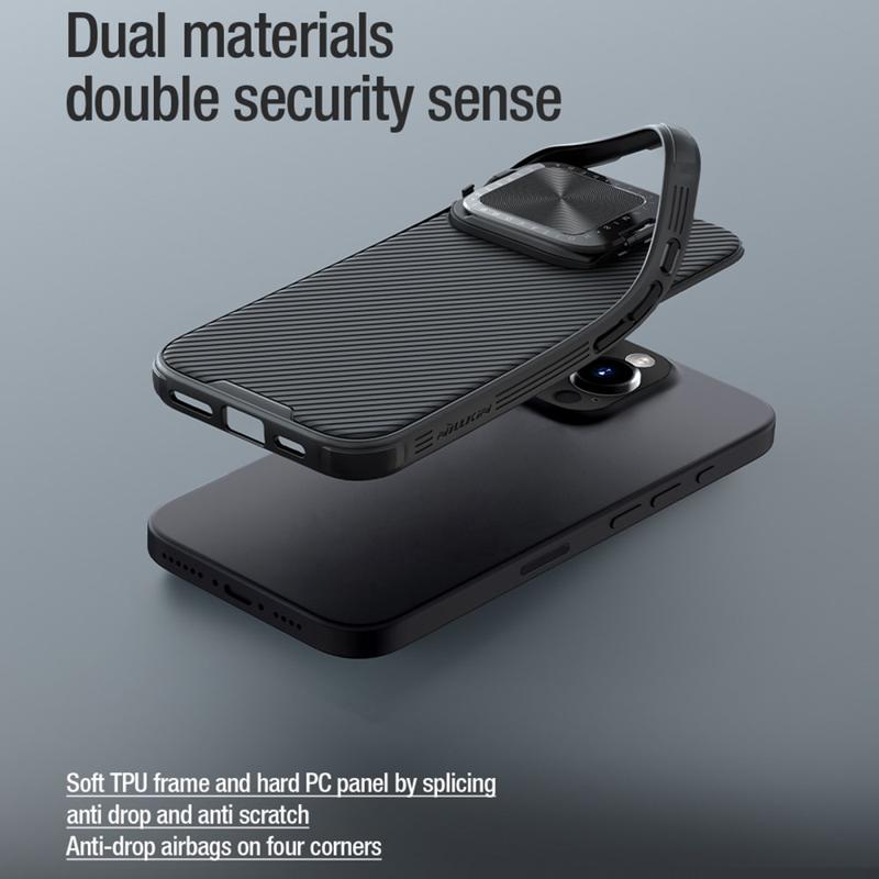 - Dieses außergewöhnliche Nillkin CamShield Prop-Hybridgehäuse besteht aus Kunststoff und TPU-Materialien