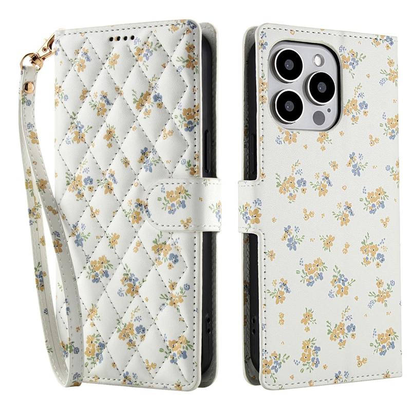 • Rhombisches Blumen Wallet Hülle für iPhone 16 Pro - mit Riemen und Kartenfächern