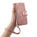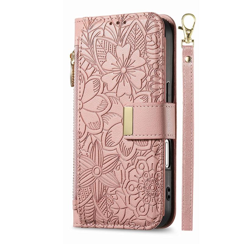 Wallet Hülle mit Blumen und Blattmuster mit Reißverschlusstasche & Handgelenkband für iPhone 16