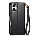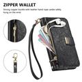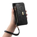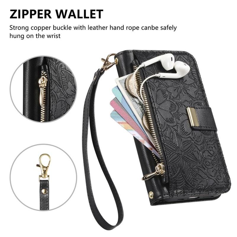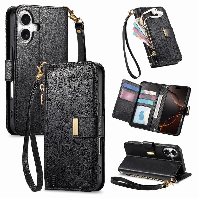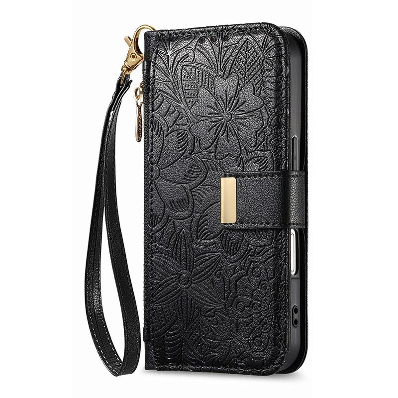 iPhone 16 Wallet Hülle mit Blumen und Blattmuster mit Reißverschlusstasche & Handgelenkband - Schwarz