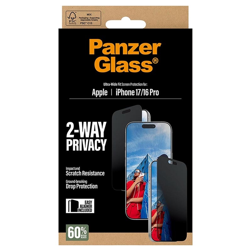 iPhone 17/16 Pro PanzerGlass Ultra-Wide Fit EasyAligner 2-Way Privacy Panzerglas - 9H - Schwarzer Rand
