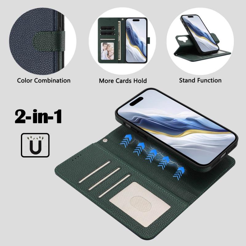 Genießen Sie die Freiheit einer abnehmbaren 2-in-1-Brieftasche. Sie verfügt über: 2 Kartenfächer, 1 Fotofach, 1 Bargeldfach.