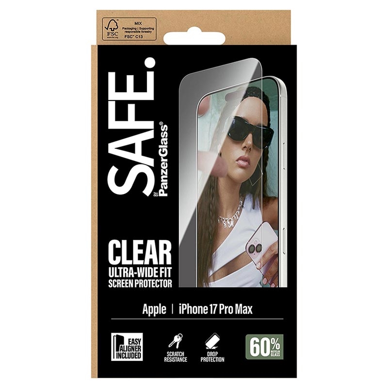 Die SAFE. by PanzerGlass Displayschutzfolie für das iPhone 17 Pro Max bietet überlegenen Schutz mit 60 % recyceltem Glas und bewahrt Ihr Gerät vor Stürzen, Kratzern und Stößen. Die ultra-breite Passform sorgt für eine vollständige Abdeckung und klare Sicht auf den Bildschirm, während die Beschichtung gegen Fingerabdrücke Ihren Bildschirm sauber hält. Mit 100 % Berührungsempfindlichkeit und einfacher Installation mit dem mitgelieferten EasyAligner verbindet diese Displayschutzfolie Nachhaltigkeit und Funktionalität nahtlos.