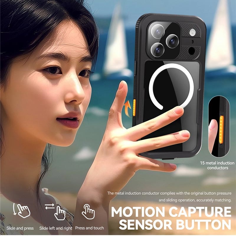 Schützen Sie Ihr iPhone 17 Pro Max bei Unterwasserabenteuern mit der Shellbox M Series IP68 Waterproof Case. Diese auf Langlebigkeit ausgelegte Metall-Tauchhülle bietet Ganzkörperschutz bis zu 15 Meter unter Wasser und ist gleichzeitig MagSafe-kompatibel für nahtloses kabelloses Laden. Die robuste Konstruktion sorgt dafür, dass Ihr Gerät auch unter extremen Bedingungen sicher bleibt und ist somit ideal für Taucher, Schnorchler und Outdoor-Fans.