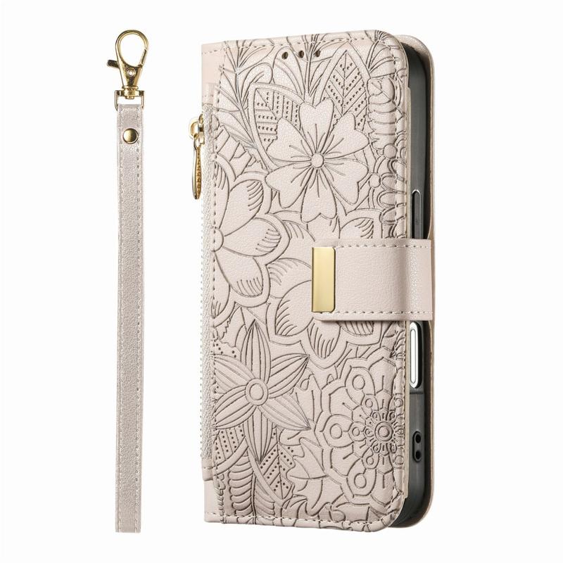 Wallet Hülle mit Blumen und Blattmuster mit Reißverschlusstasche & Handgelenkband für iPhone 17