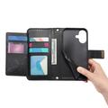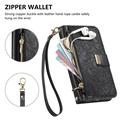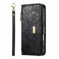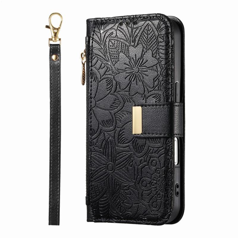 iPhone 17 Wallet Hülle mit Blumen und Blattmuster mit Reißverschlusstasche & Handgelenkband - Schwarz