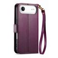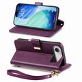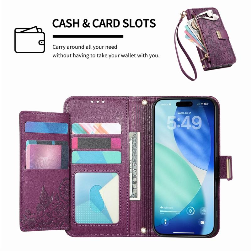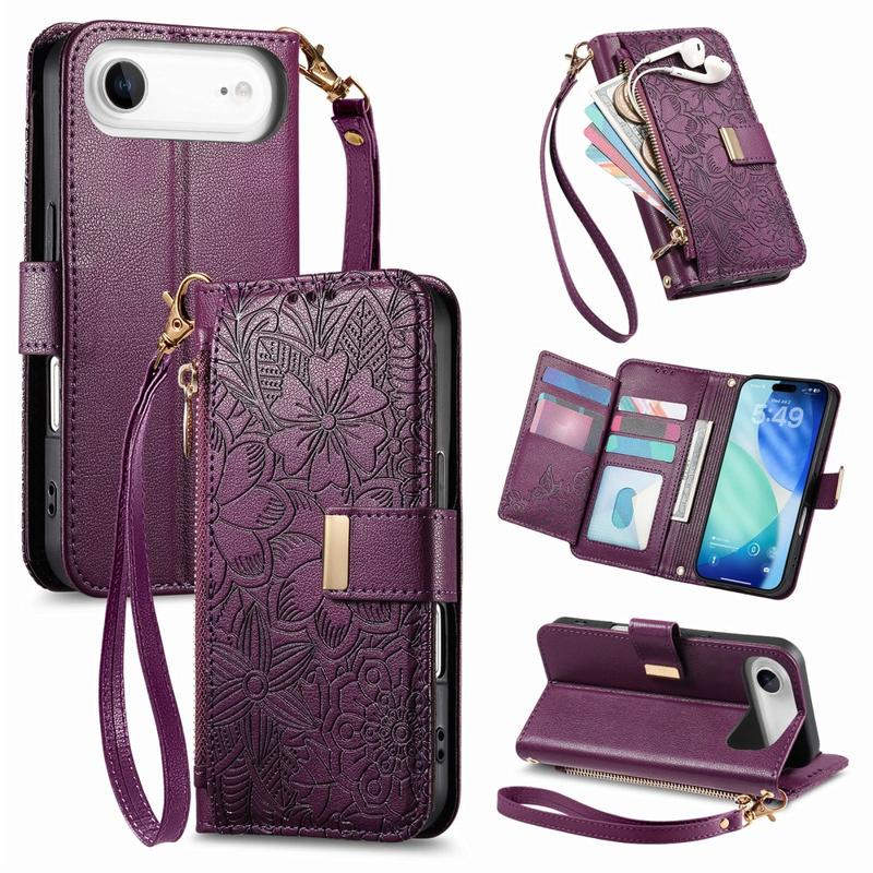 iPhone Air Wallet Hülle mit Blumen und Blattmuster mit Reißverschlusstasche & Handgelenkband - Lila