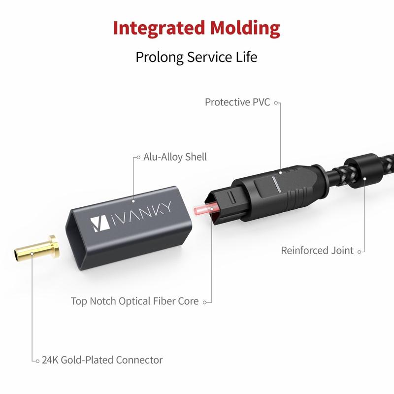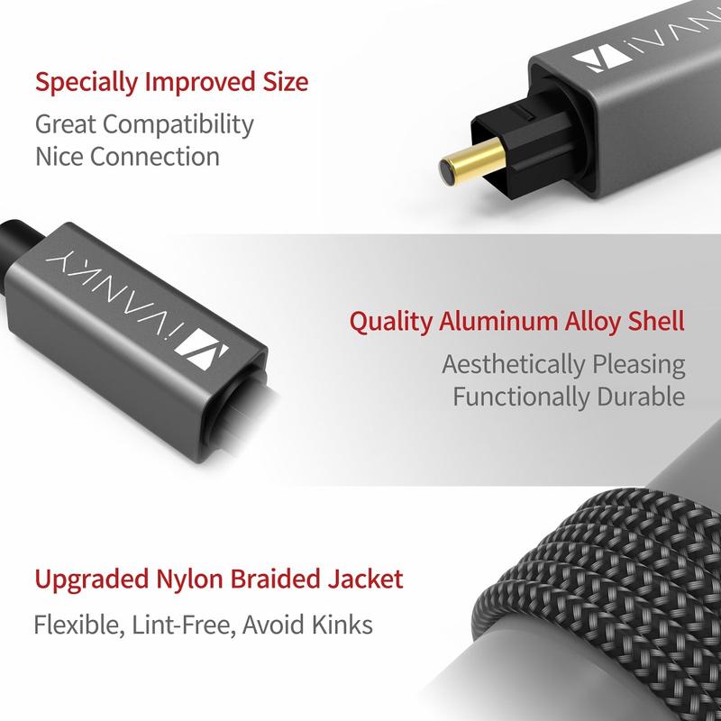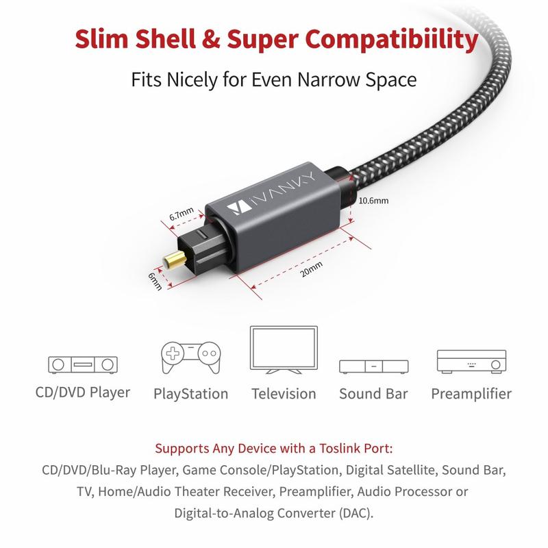 Genießen Sie sauberen, störungsfreien Klang mit dem optischen Toslink-Audiokabel IVANKY OC03. Dieses 3 m lange Glasfaserkabel wurde für eine zuverlässige digitale Audioübertragung entwickelt und ist ideal für den Anschluss eines Fernsehers an eine Soundbar, einen AV-Receiver, ein Heimkinosystem oder eine Spielekonsole. Das schlanke Steckergehäuse passt auch in enge Räume, während das Gehäuse aus einer Aluminiumlegierung für Langlebigkeit im täglichen Gebrauch sorgt. Ein flexibler, geflochtener Nylonmantel hilft, Verwicklungen und Knicke zu vermeiden, und die mitgelieferten abnehmbaren Gummikappen schützen die Anschlüsse, wenn das Kabel nicht verwendet wird. Schließen Sie das Kabel einfach an, um eine feste, stabile Verbindung und ein klares digitales Audiosignal zu erhalten.